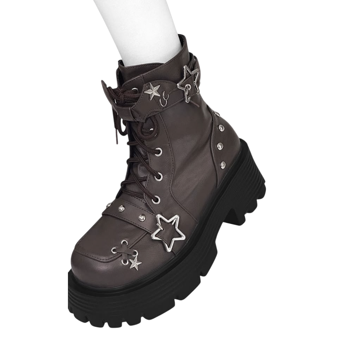 Botines con plataforma gruesa o chinky color café con decoración de estrellas en metal con estilo: punk gótico / street goth / cyber grunge.